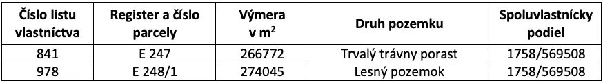 – Výmera spoluvlastníckych podielov tvorí spolu 1.669,43 m2, pričom pozemky sú evidované na listoch vlastníctva č. 841 a č. 978.