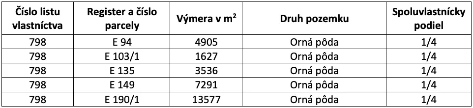 – Predávané pozemky sú evidované na liste vlastníctva č. 798 pre k.ú. Bohdanovce, pričom na liste vlastníctva sú vedené ako orná pôda.