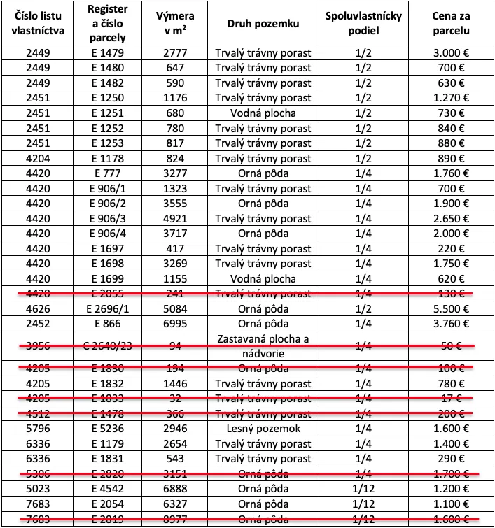 – Výmera spoluvlastníckych podielov tvorí spolu 16.843,25 m2, pričom pozemky sú na listoch vlastníctva vedené ako Orná pôda, Trvalý trávny porast, Lesný pozemok a Vodná plocha.