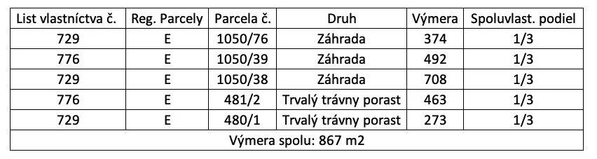 – Pozemky sú evidované na liste vlastníctva č. 776 a 729 pre katastrálne územie Dvorníky, pričom na liste vlastníctva sú vedené ako Trvalý trávny porast a Záhrada.