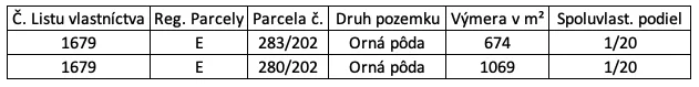 – Výmera spoluvlastníckych podielov tvorí spolu 87,15 m2, pričom pozemky sú na listoch vlastníctva evidované ako Orná pôda.