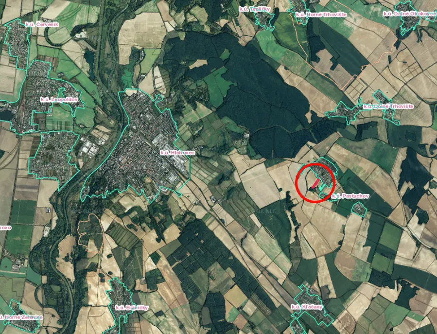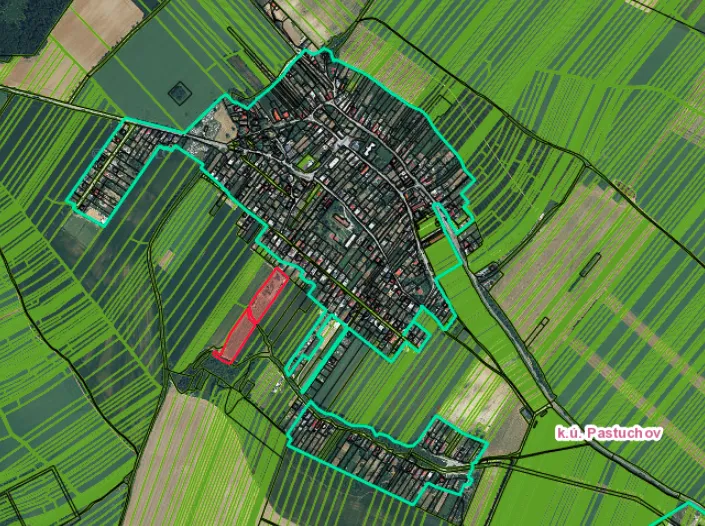 – Pozemok je tvorený 2 parcelami („E“ 2276 a „E“ 2277), evidovanými na liste vlastníctva č. 552 pre katastrálne územie Pastuchov, okres Hlohovec.