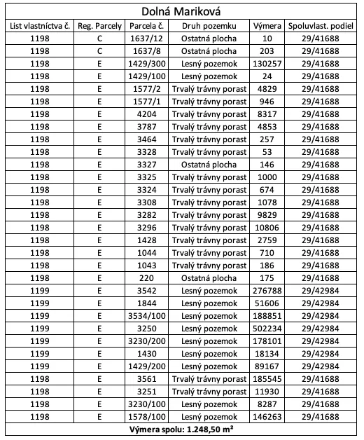 1.248,47 m² pre katastrálne územie Dolná Mariková, pozemky sú evidované na listoch vlastníctva č. 1198 a 1199.