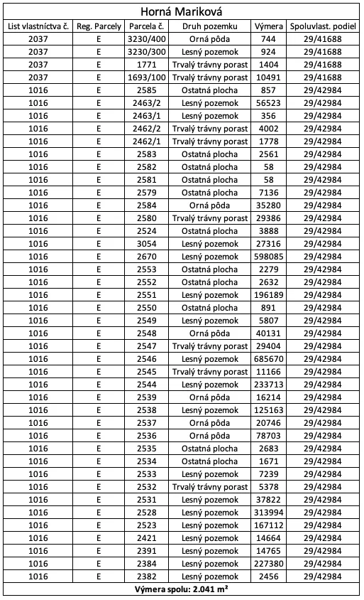 2.040,99 m² pre katastrálne územie Horná Mariková, pozemky sú evidované na listoch vlastníctva č. 2037 a 1016.