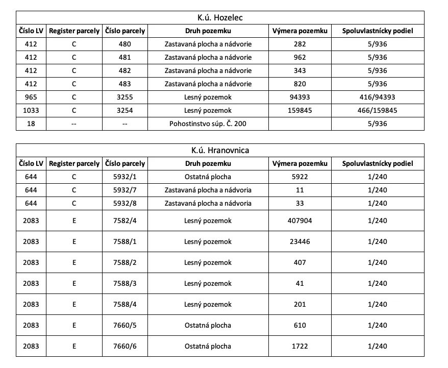 Výmera spoluvlastníckych podielov v k.ú. Hranovnica tvorí spolu 1.834,57 m2, pričom pozemky sú evidované na listoch vlastníctva č. 644 a 2083.