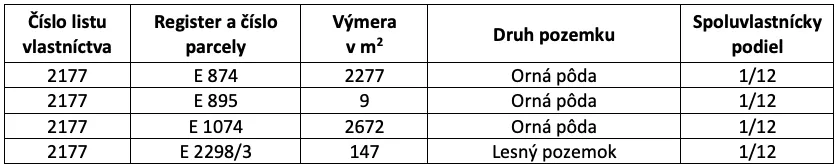 – Výmera spoluvlastníckeho podielu tvorí spolu 425,42 m2, pričom pozemky sú na liste vlastníctva vedené ako Orná pôda a Lesný pozemok.