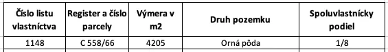 – Pozemok je evidovaný na liste vlastníctva č. 1148 pre katastrálne územie Kamenný Most, pričom pozemok je na liste vlastníctva vedený ako Orná pôda.