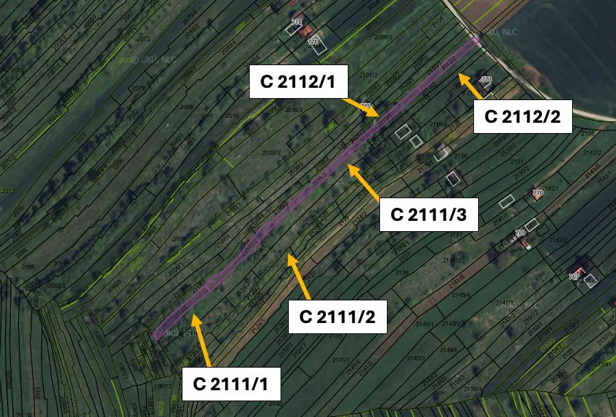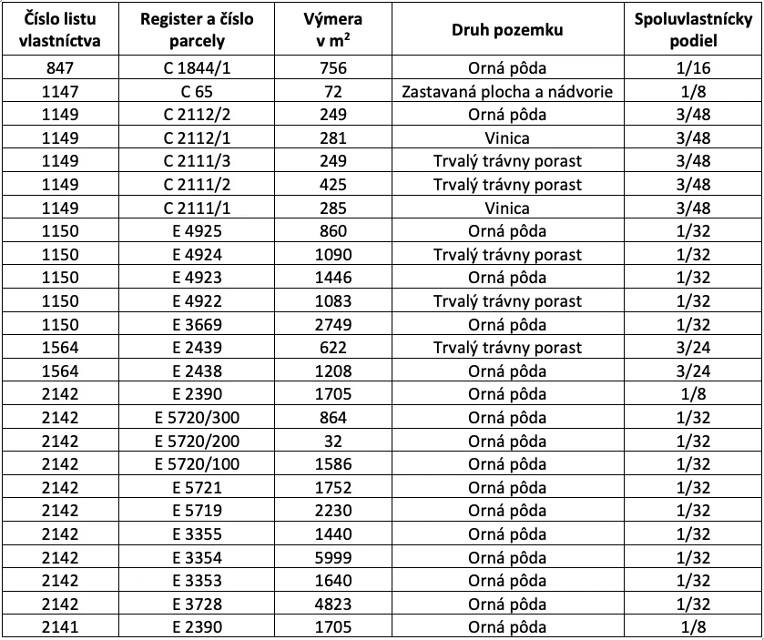 – Pozemky sú evidované na liste vlastníctva č. 847, 1147, 1149, 1150, 1564, 2142 a 2141 pre katastrálne územie Kamenný Most, pričom na liste vlastníctva sú vedené ako Orná pôda, Zastavaná plocha a nádvorie, Vinica a Trvalý trávny porast.
