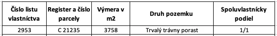 – Predávaný pozemok – parc. reg. „C“ č. 21235 je evidovaný na liste vlastníctva pre katastrálne územie Krušetnica, pričom je vedený ako Trvalý trávny porast.