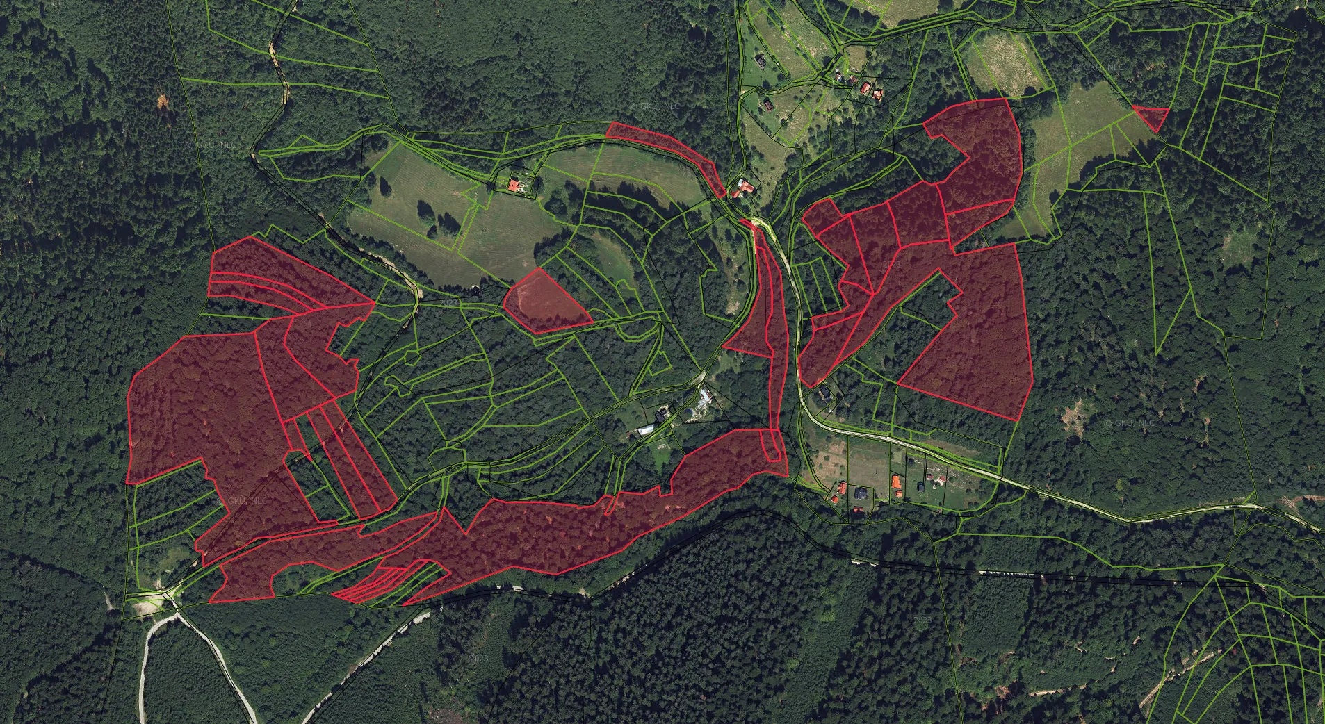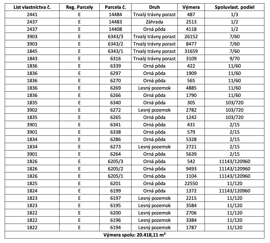 – Výmera spoluvlastníckych podielov tvorí spolu 20.418,11 m2, pričom pozemky sú na listoch vlastníctva vedené ako Orná pôda, Lesný pozemok, Záhrada.