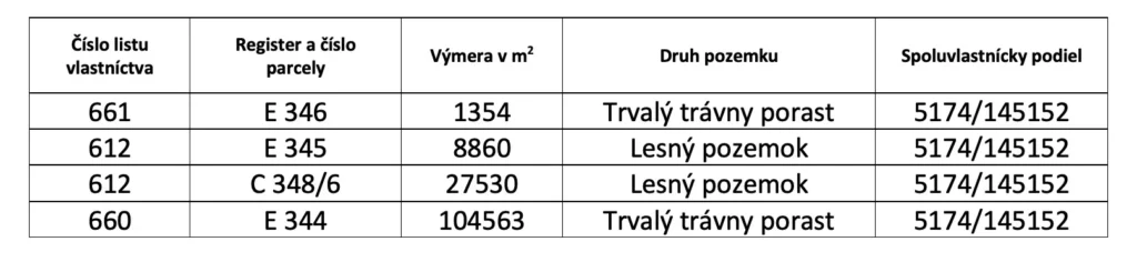 – Výmera spoluvlastníckych podielov tvorí celkom 5.072,59 m2, pričom pozemky sú evidované na liste vlastníctva č. 612, 660 a 661 pre katastrálne územie Beňušovce a vedené sú ako Lesný pozemok a Trvalý trávny porast.