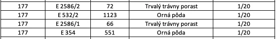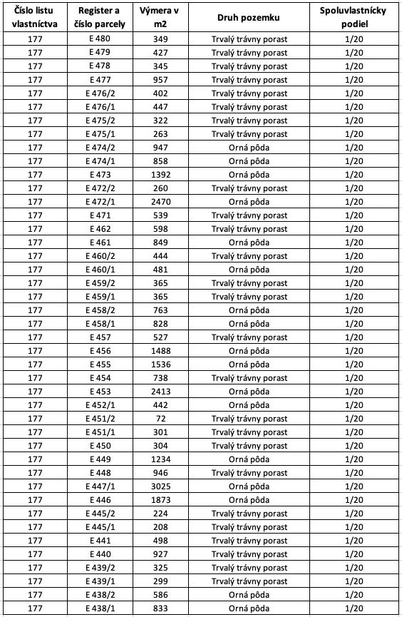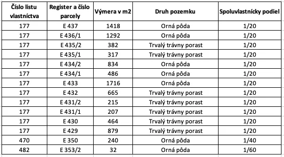 – Výmera spoluvlastníckych podielov tvorí spolu 3.944,53 m2 a pozemky sú na listoch vlastníctva vedené ako Orná pôda a Trvalý trávny porast.