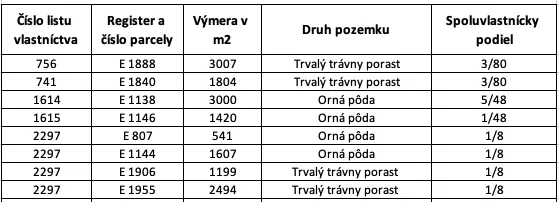 – Výmera spoluvlastníckych podielov tvorí spolu 1.207,52 m2, pričom pozemky sú na listoch vlastníctva evidované ako Orná pôda a Trvalý trávny porast.