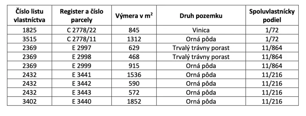 – Výmera spoluvlastníckeho podielu tvorí celkom 287,29 m2. Pozemky sú evidované na listoch vlastníctva č. 1825, 3515, 2369, 2432 a 3402 pre katastrálne územie Marcelová, pričom na liste vlastníctva sú vedené ako Orná pôda, Trvalý trávny porast a Vinica.