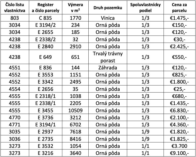 – Výmera spoluvlastníckeho podielu tvorí spolu 17.566,56 m2 a parcely sú na listoch vlastníctva vedené ako Orná pôda, Trvalý trávny porast, Vinica a Záhrada.