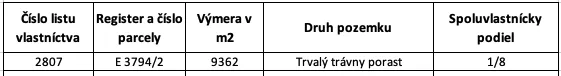 – Výmera spoluvlastníckeho podielu tvorí spolu 1.170,25 m2. Pozemok je evidovaný na liste vlastníctva č. 2807 a vedený je ako Trvalý trávny porast.