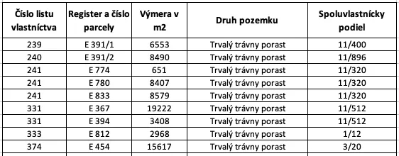 – Výmera spoluvlastníckych podielov tvorí spolu 3.966.78 m2, pričom pozemky sú na listoch vlastníctva evidované ako Trvalý trávny.