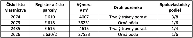 – Výmera spoluvlastníckych podielov tvorí spolu 13.283,71 m2, pričom pozemky sú na listoch vlastníctva vedené ako Orná pôda a Trvalý trávny porast.
