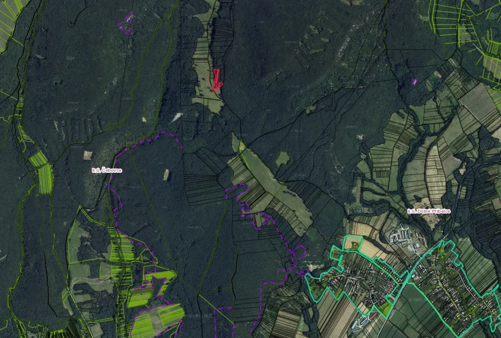 – Predávaný pozemok – parc. reg. „C“ 2620, 2621 a spoluvlastnícky podiel na parc. reg. „C“ 2619 sú evidované na listoch vlastníctva č. 1808 a 1999 pre katastrálne územie Horné Príbelce, pričom na liste vlastníctva sú vedené ako Lesný pozemok a Trvalý trávny porast.