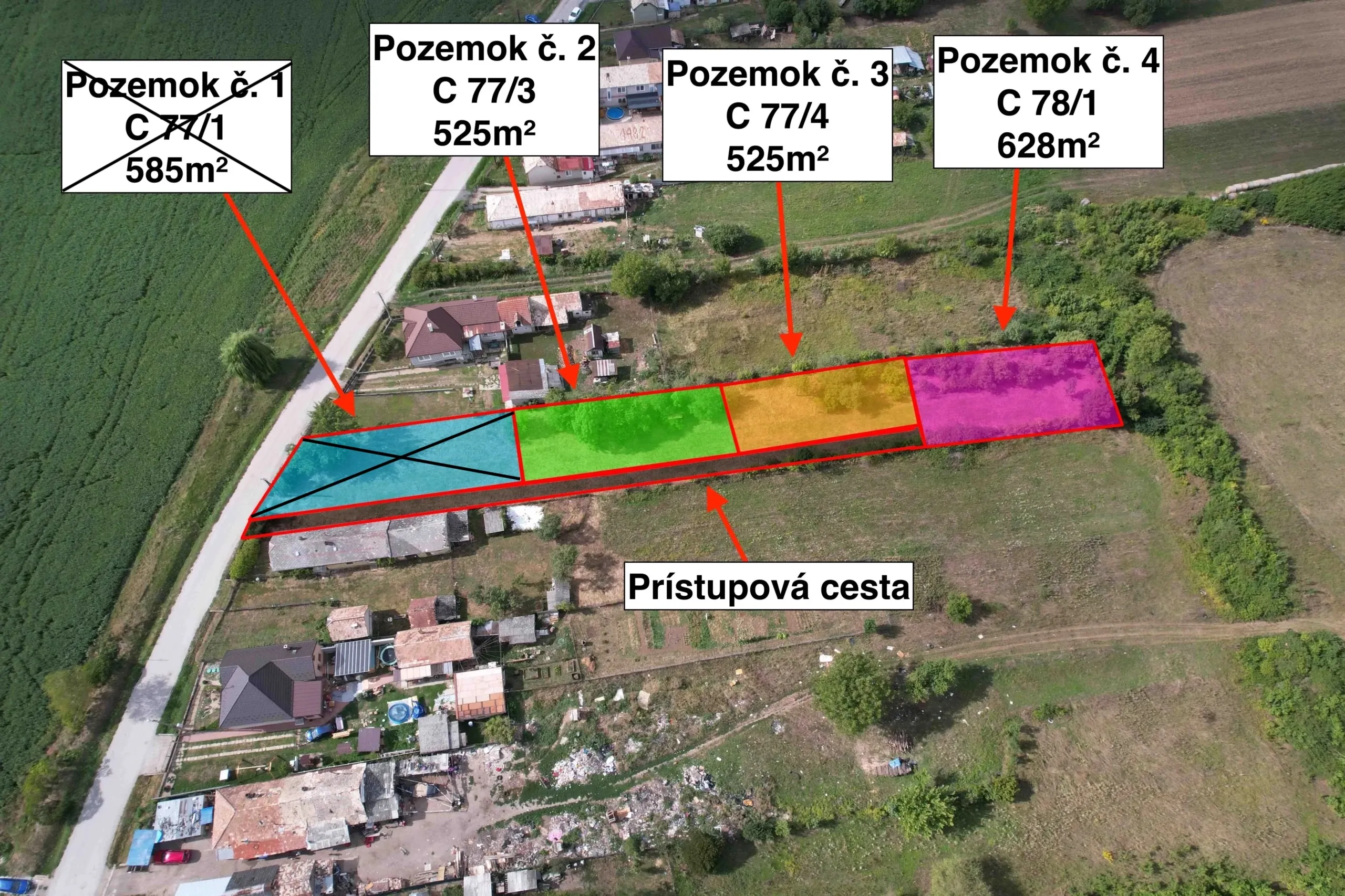 Pozemok 2 (zelený) – parcela „C“ 77/3 – výmera: 525 m2, cena: €6.500,- EUR