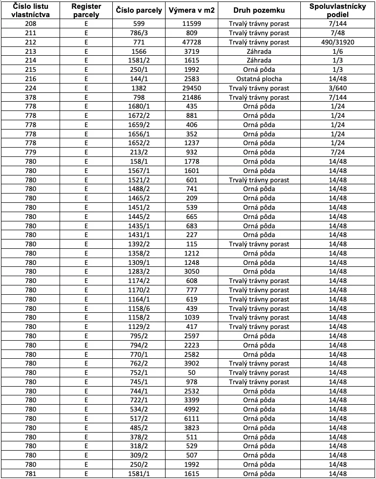 – Výmera predávaných spoluvlastníckych podielov tvorí celkom 21.598,03 m2. Pozemky sú evidované na listoch vlastníctva č. 208, 211, 212, 213, 214, 215, 216, 224, 378, 780, 781, 778 a 779 pre katastrálne územie Rozbehy, pričom na listoch vlastníctva sú vedené ako Orná pôda, Trvalý trávny porast, Záhrada a Ostatná plocha.
