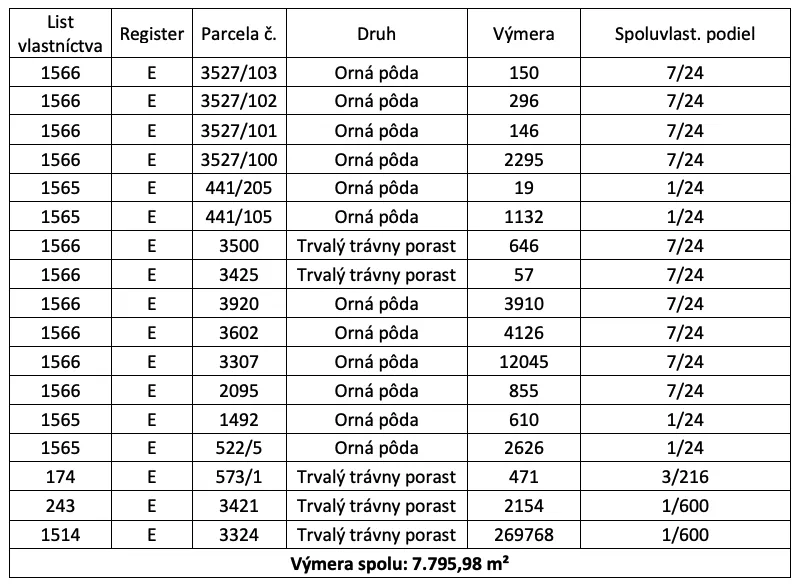 – Výmera spoluvlastníckych podielov tvorí spolu 7.795,98 m² a pozemky sú na listoch vlastníctva vedené ako Orná pôda a Trvalý trávny porast.