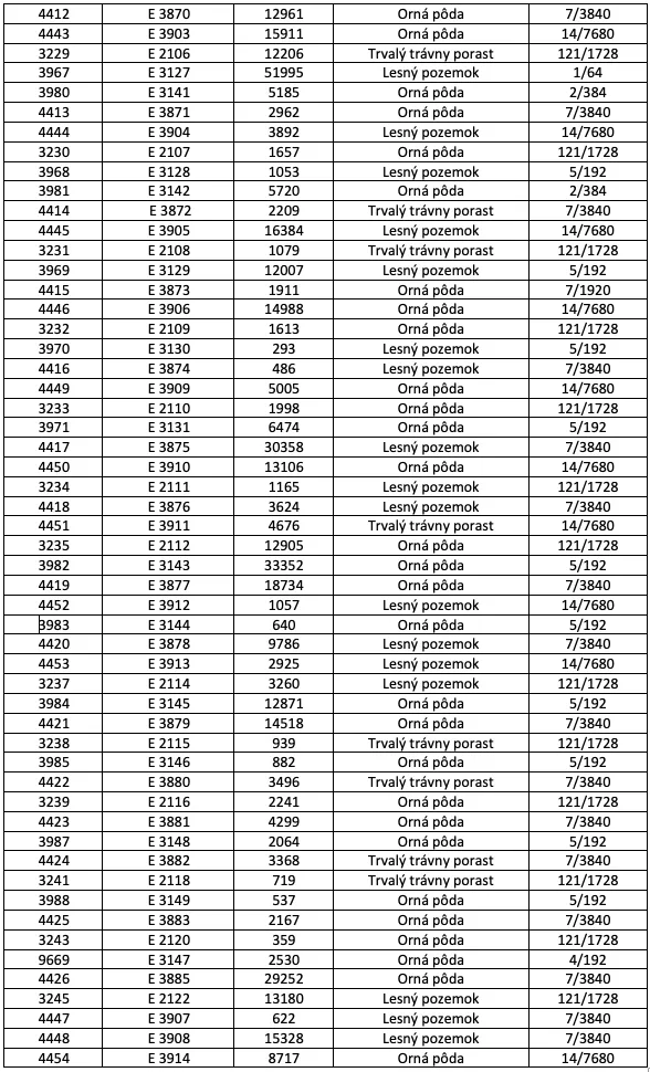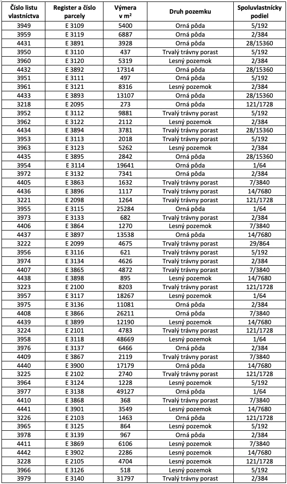 – Výmera spoluvlastníckych podielov tvorí spolu 12.519,02 m2, pričom pozemky sú na listoch vlastníctva vedené ako Orná pôda, Trvalý trávny porast a Lesný pozemok.