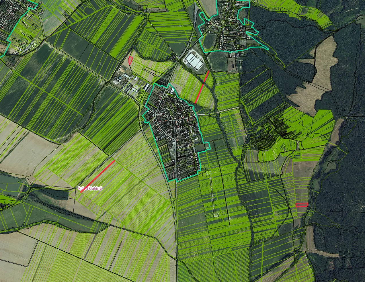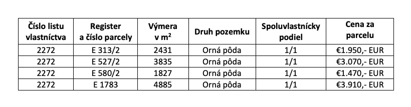 – Parcely sú evidované na liste vlastníctva č. 2272 pre katastrálne územie Sklabiná, majú celkovú výmeru 12.978,00 m2, pričom na liste vlastníctva sú vedené ako Orná pôda.