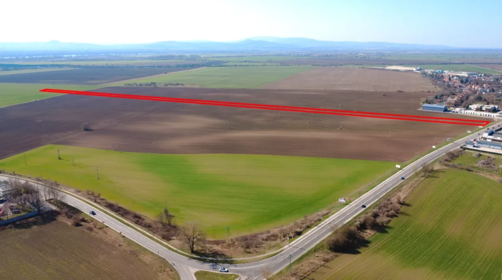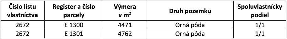 – Pozemok je tvorený 2 parcelami (reg. „E“ 1300 a „E“ 1301), ktoré majú spolu výmeru 9.233 m2 (približné rozmery 10m x 925m), pričom na liste vlastníctva č. 2672 sú vedené ako Orná pôda.
