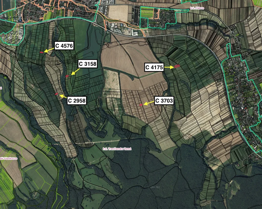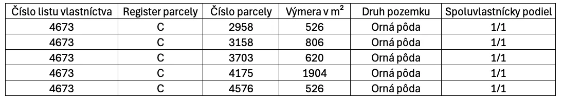 – Predávané parcely sú evidované na liste vlastníctva č. 4673 („C“ 2958, 3158, 3703, 4175, 4576) pre katastrálne územie Trenčianska Turná, majú celkovú výmeru 4.382,00 m2, pričom na liste vlastníctva sú vedené ako Orná pôda. – Pozemky je možné kúpiť aj jednotlivo. V prípade kúpy jednotlivých pozemkov je cena €2,20/m² – Mapu s vyznačením parciel a tabuľku predávaných pozemkov možno nájsť v galérii inzerátu, medzi fotografiami. – Predávané pozemky sú vhodné pre poľnohospodárov, prípadne ako investičné pozemky. – Uvedená cena je konečná a zahŕňa kompletný právny servis vrátane prípravy kúpnych zmlúv, vklad do katastra nehnuteľností a správne poplatky.