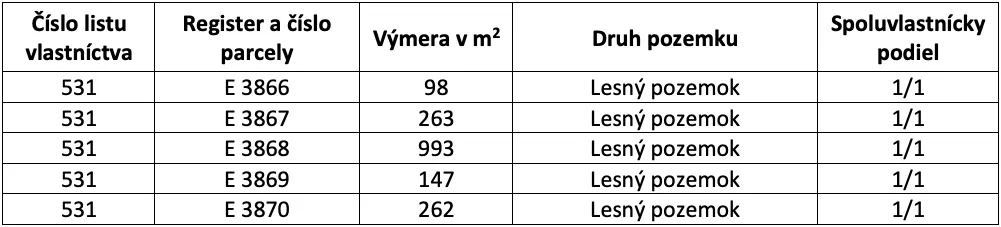 – Pozemok je tvorený parcelami „E“ 3866, 3867, 3868, 3869 a 3870, ktoré sú evidované na liste vlastníctva č. 531 pre katastrálne územie Veličná, okres Dolný Kubín a na liste vlastníctva sú vedené ako Lesný pozemok.