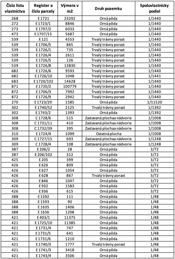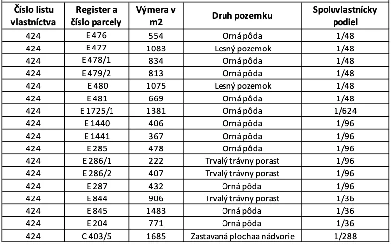 – Výmera spoluvlastníckych podielov tvorí spolu 1.419.70 m2 a pozemky sú na listoch vlastníctva vedené ako Orná pôda, Trvalý trávny porast, Zastavaná plocha a nádvorie a Lesný pozemok.