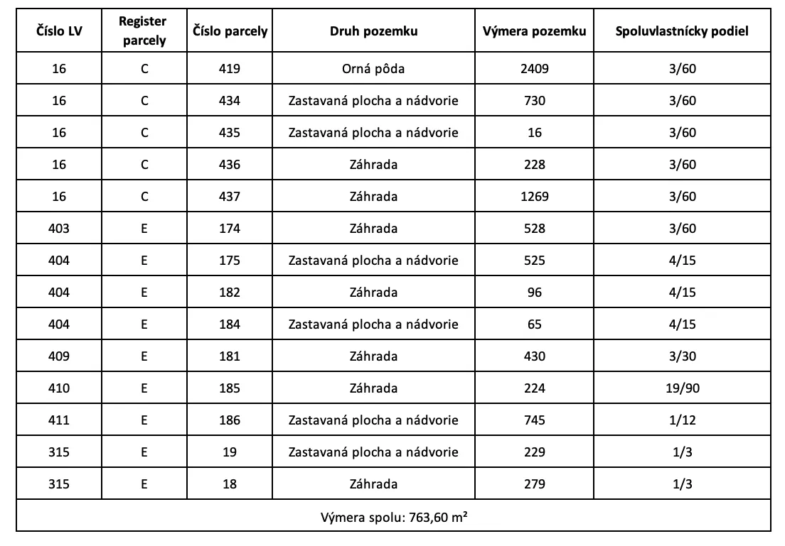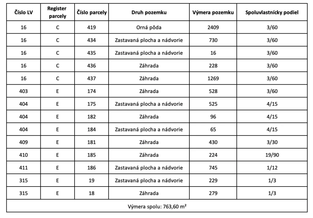 – Výmera predávaných spoluvlastníckych podielov celkovo tvorí 763,60 m².