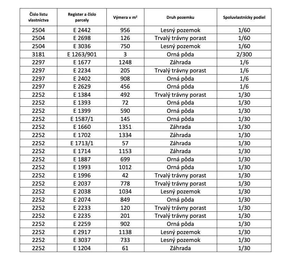– Výmera spoluvlastníckych podielov tvorí spolu 925.48 m2 a pozemky sú na listoch vlastníctva vedené ako Orná pôda, Trvalý trávny porast, Záhrada a Lesný pozemok.